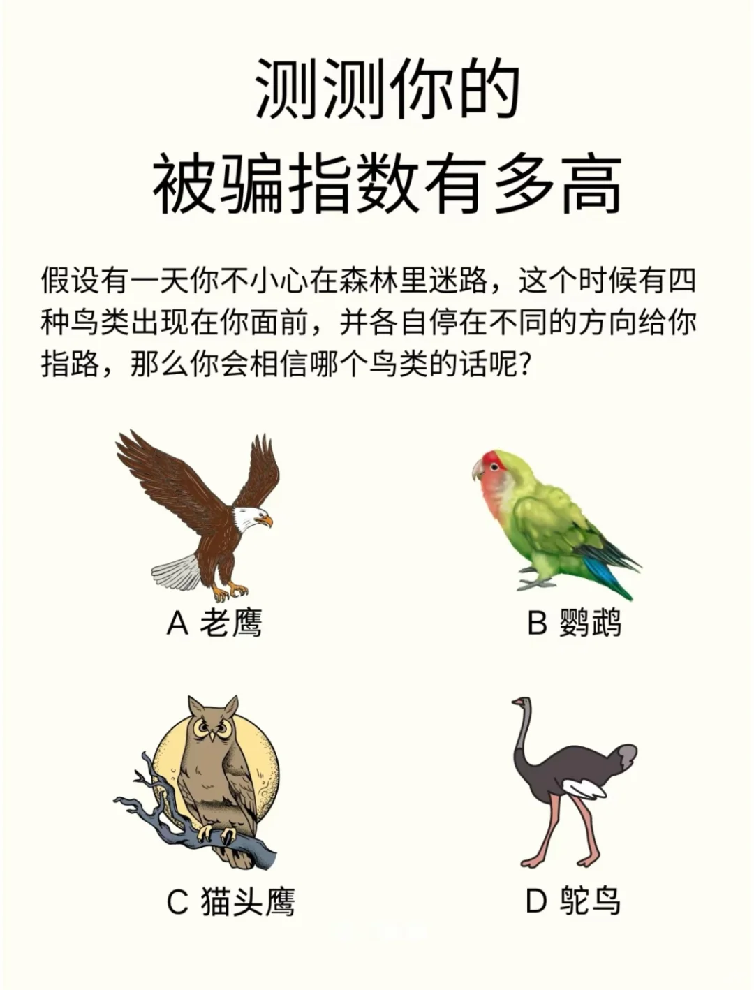 假定有一天你不注意在丛林里迷途,这个本事有四种鸟类出当今你眼前,并各自停在不同的地方给你指路,那么你会信服哪个鸟类的话呢?